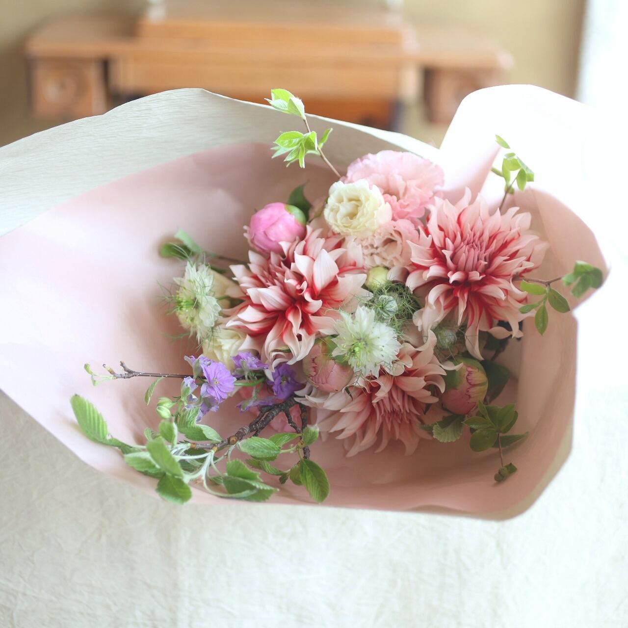 「今」、「この瞬間」を切り取ったような、ナチュラルな雰囲気の花束。