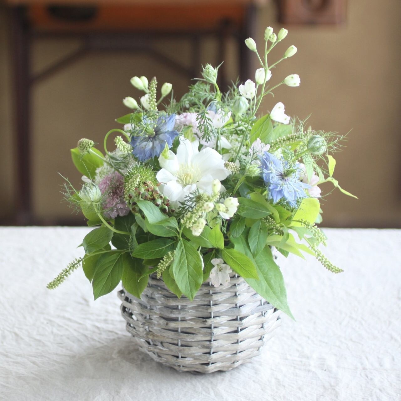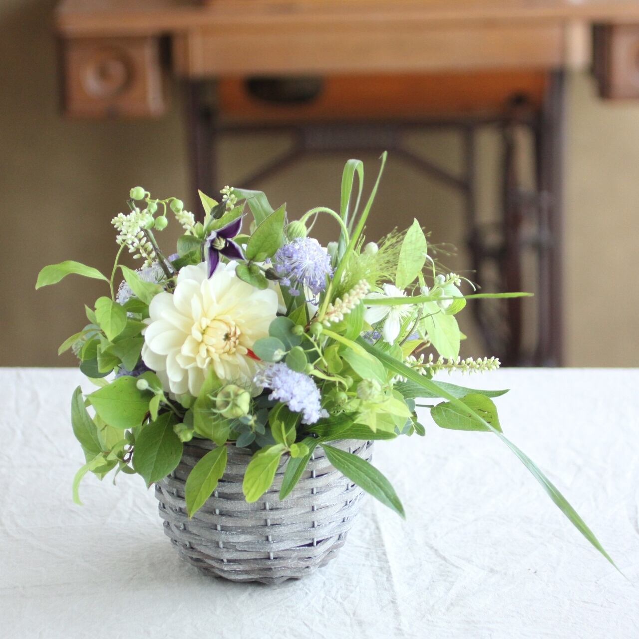 le petit bonheur セレクトの、季節の花をオアシス(吸水性スポンジ)に挿してお作りするアレンジメントです。