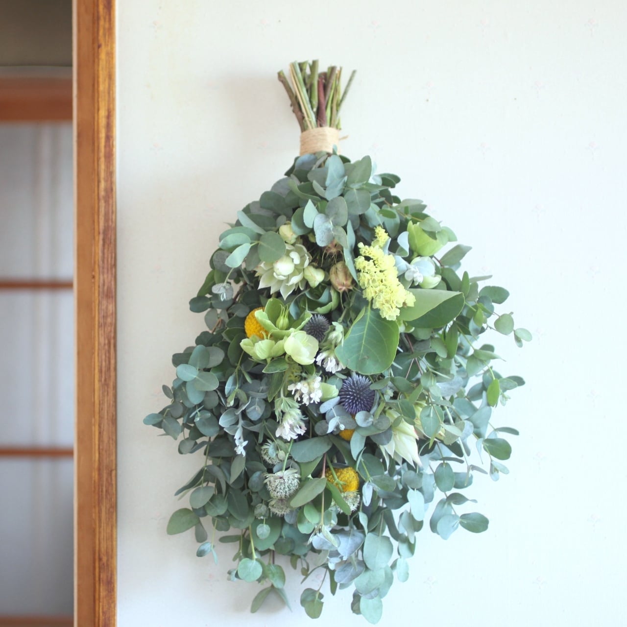 フレッシュな植物たちを束ね、お届け後、飾りながら少しずつドライフラワーへと変化していく様をお楽しみいただけます。
