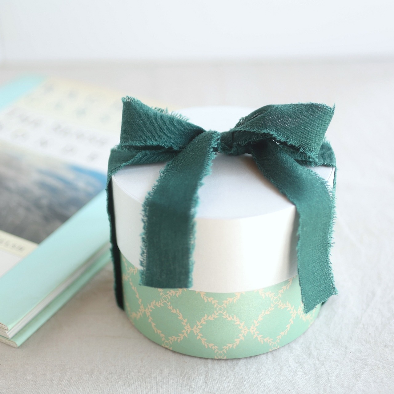 幅の広い深みのあるグリーンのリボンを、きゅっと結んでいます。